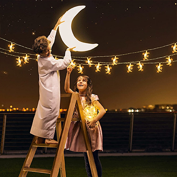 تصميم مميز لديكورات رمضان ابتكر جوًا مريحًا ورومانسيًا باستخدام شريط الإضاءة هذا لإضاءة لحظاتك الخاصة مع أحبائك. إضاءة دافئة مصابيح رمضان هذه مثالية للإضاءة الداخلية والخارجية. ما عليك سوى لفها حول الأشجار أو أسطح الفناء أو إطارات الأبواب أو النوافذ للحفلات أو العطلات أو الديكورات اليومية. سلسلة مصابيح على شكل قمر ونجوم تعمل بالبطارية ومقاومة للماء تعمل هذه المصابيح بالبطارية، لا تحتاج إلى قابس وسلك تمديد، كل من سلسلة المصابيح وحافظة البطارية مقاومة للماء، مما يسمح لك بوضع المصابيح في الداخل أو الخارج. غير محدود يبلغ طوله الإجمالي 10 أمتار (32 قدم)، مما يساعدك على تزيين غرفة المعيشة أو غرفة النوم في منزلك. ستجد أن تزيين منزلك أصبح ممتعًا للغاية. سيخلق تأثير الإضاءة المريح والرائع والرومانسي جوًا لطيفًا في منزلك طوال العام.